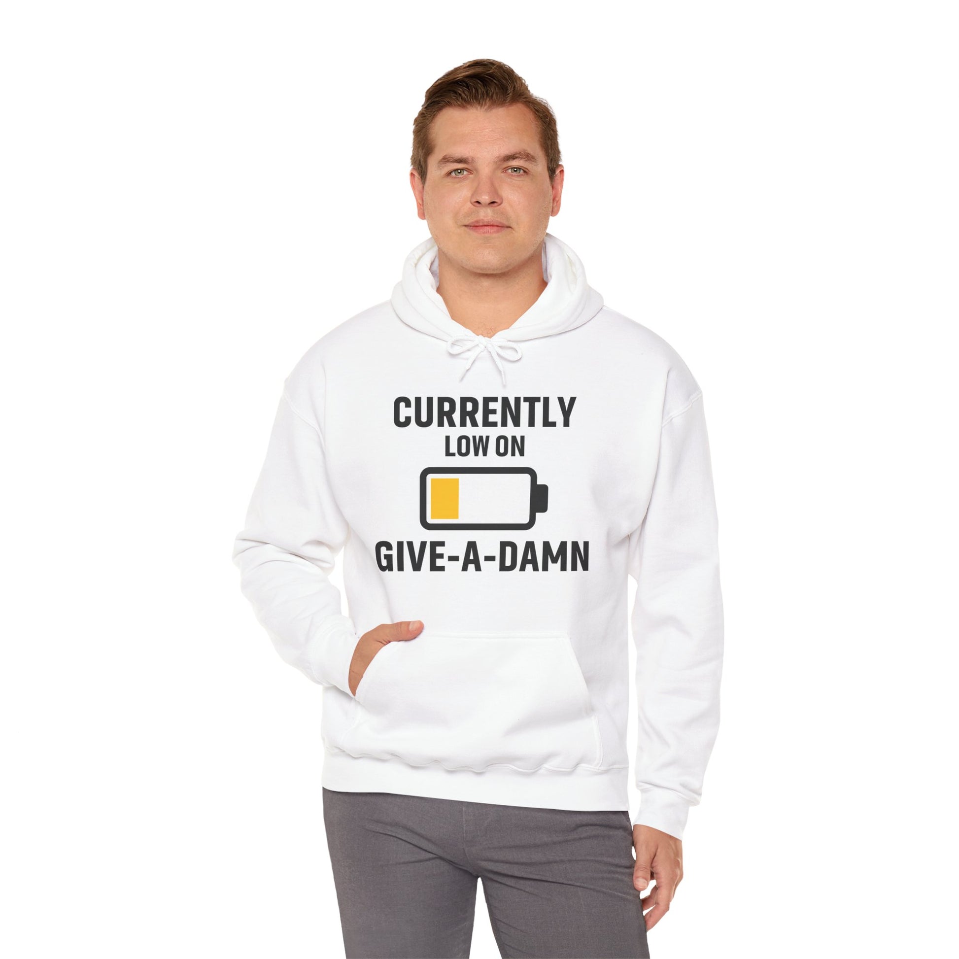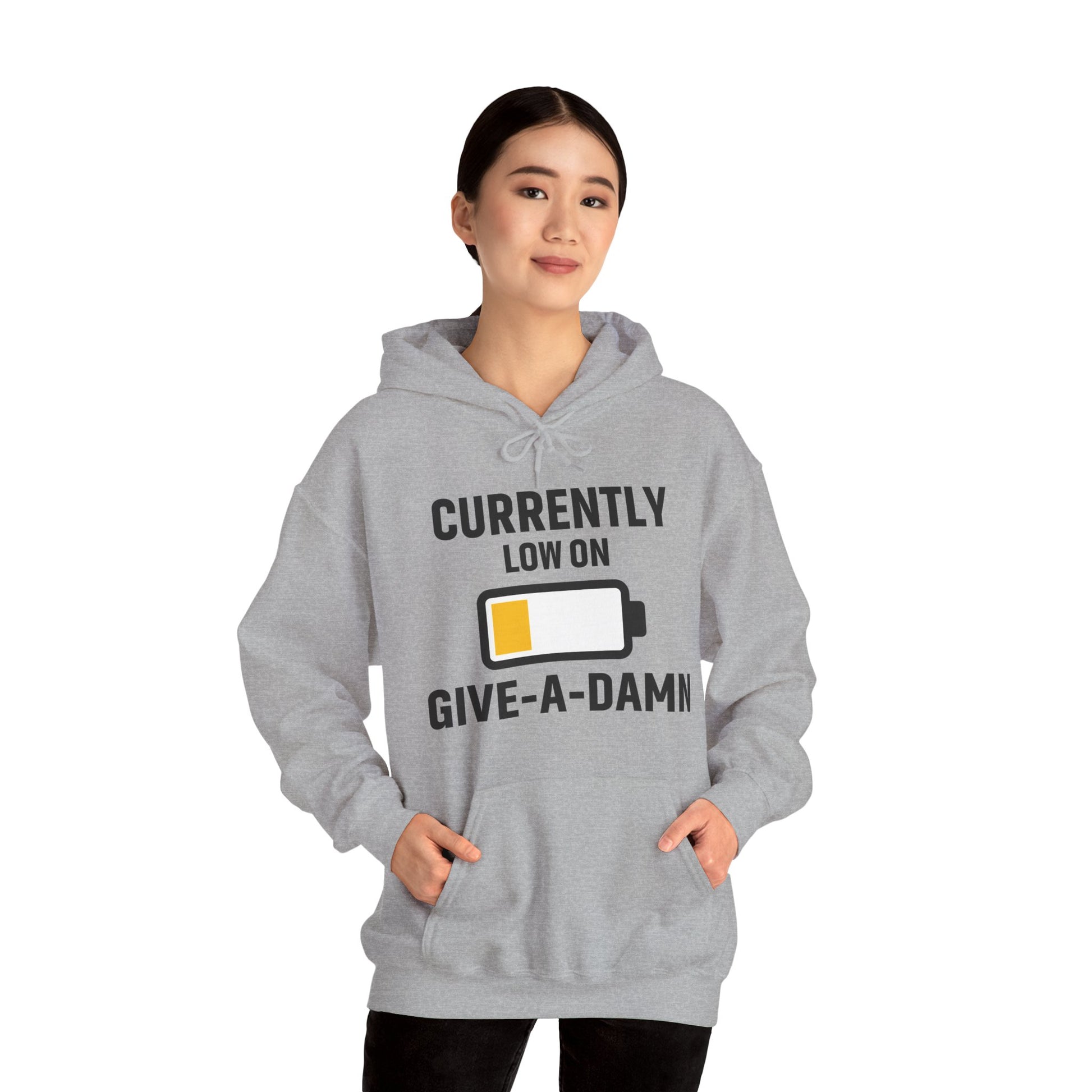 Currently Low On Give-A-Damn Unisex Hoodie | Casual Gift for Office Friends, Cozy Hoodie for Laughs, Humorous Apparel