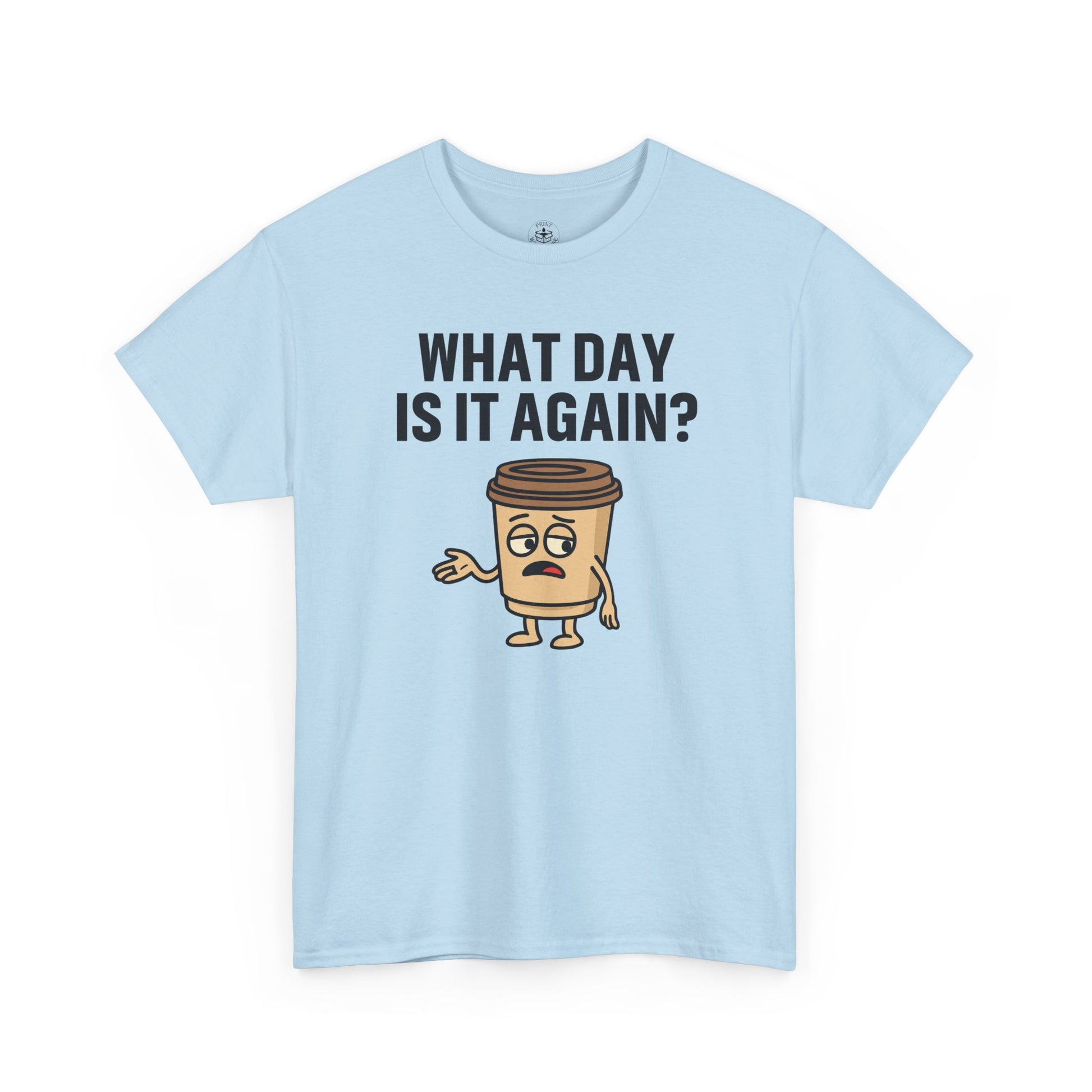 Coffee Cup Guy What Day Is It Again? Unisex T-Shirt | Funny Coffee Shirt, Casual Gift, Coffee Lover Apparel, Perfect for Office Attire
