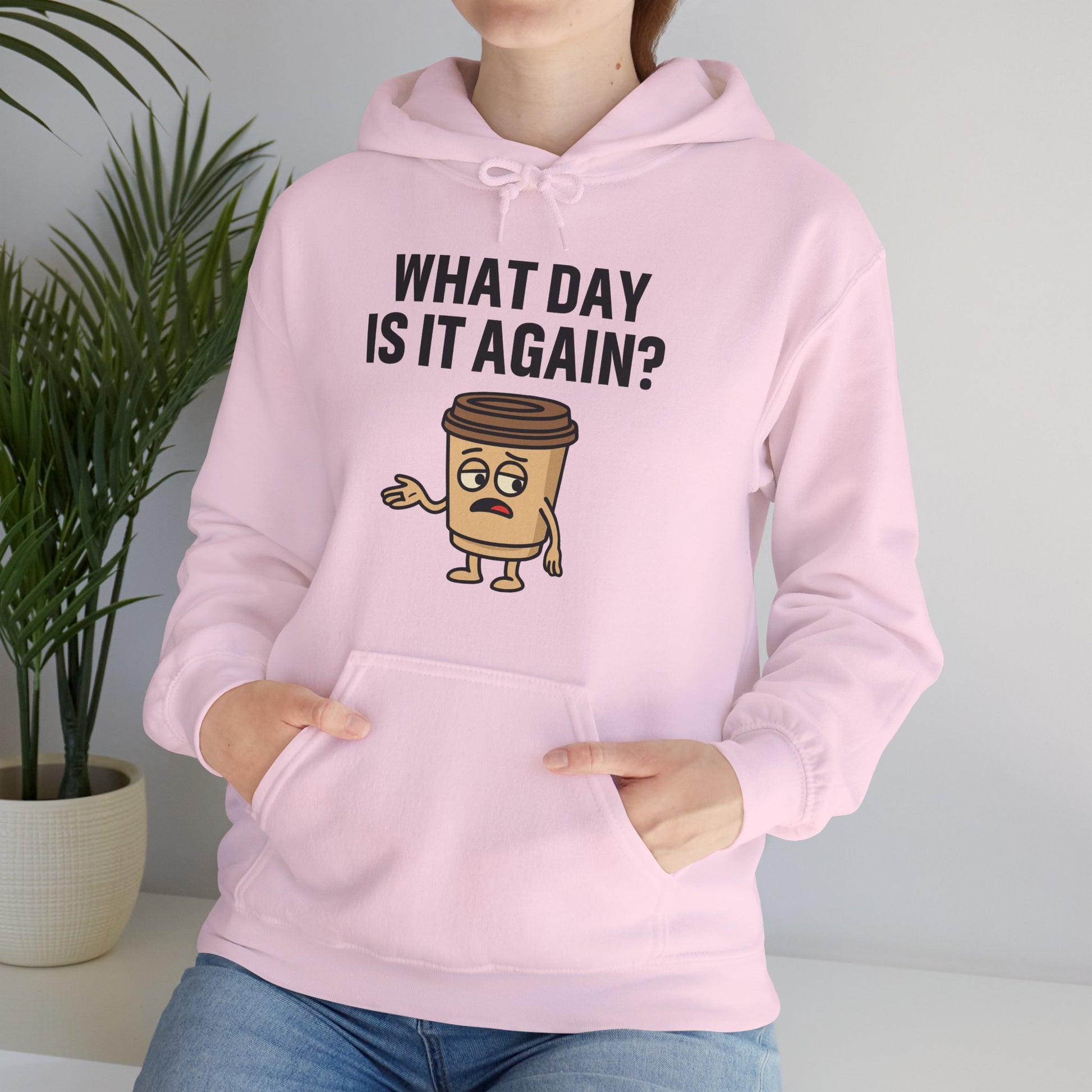 Stay cozy and light-hearted with this unisex heavy blend hooded sweatshirt, perfect for everyday wear. Its playful design features a quirky character asking, "What day is it again?"βan ideal reminder for coffee lovers and those with a busy life. This sweatshirt brings a fun vibe to casual outings, lazy weekends, or cozy nights in. It's a great gift for friends, family, or anyone who loves a good laugh, making it suitable for holidays like birthdays, Christmas, or just because!
