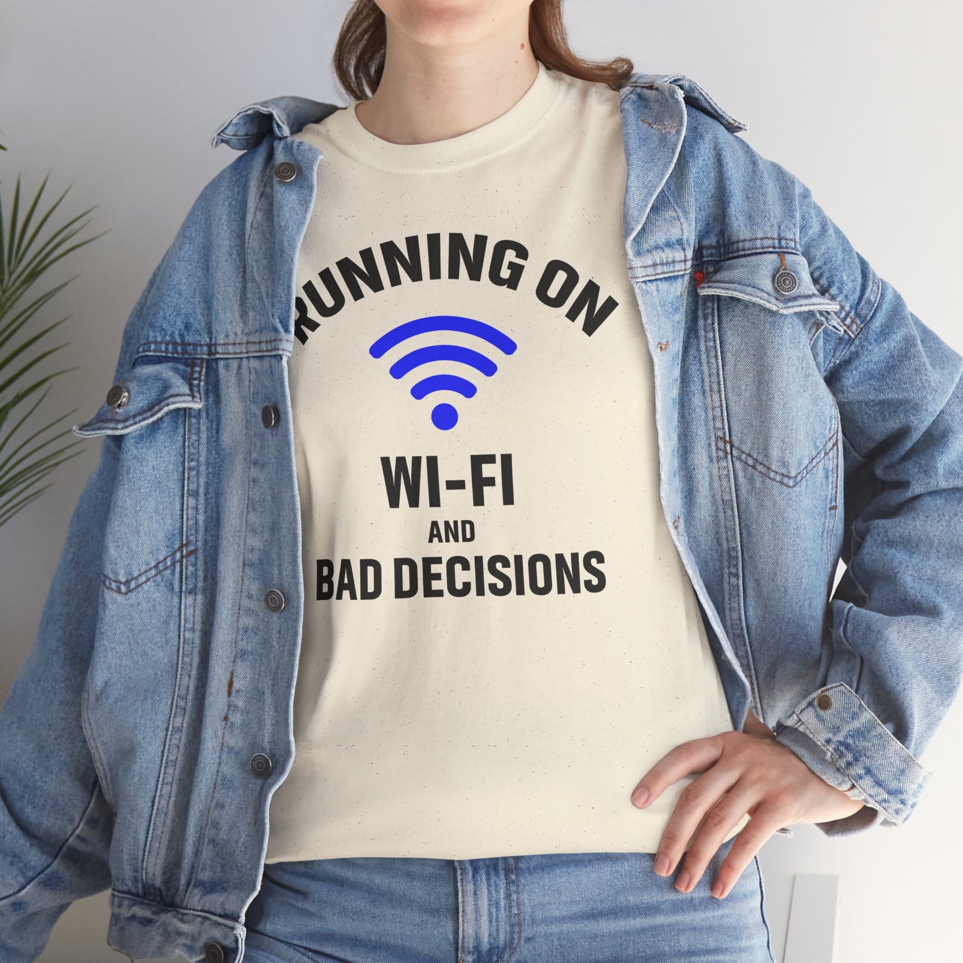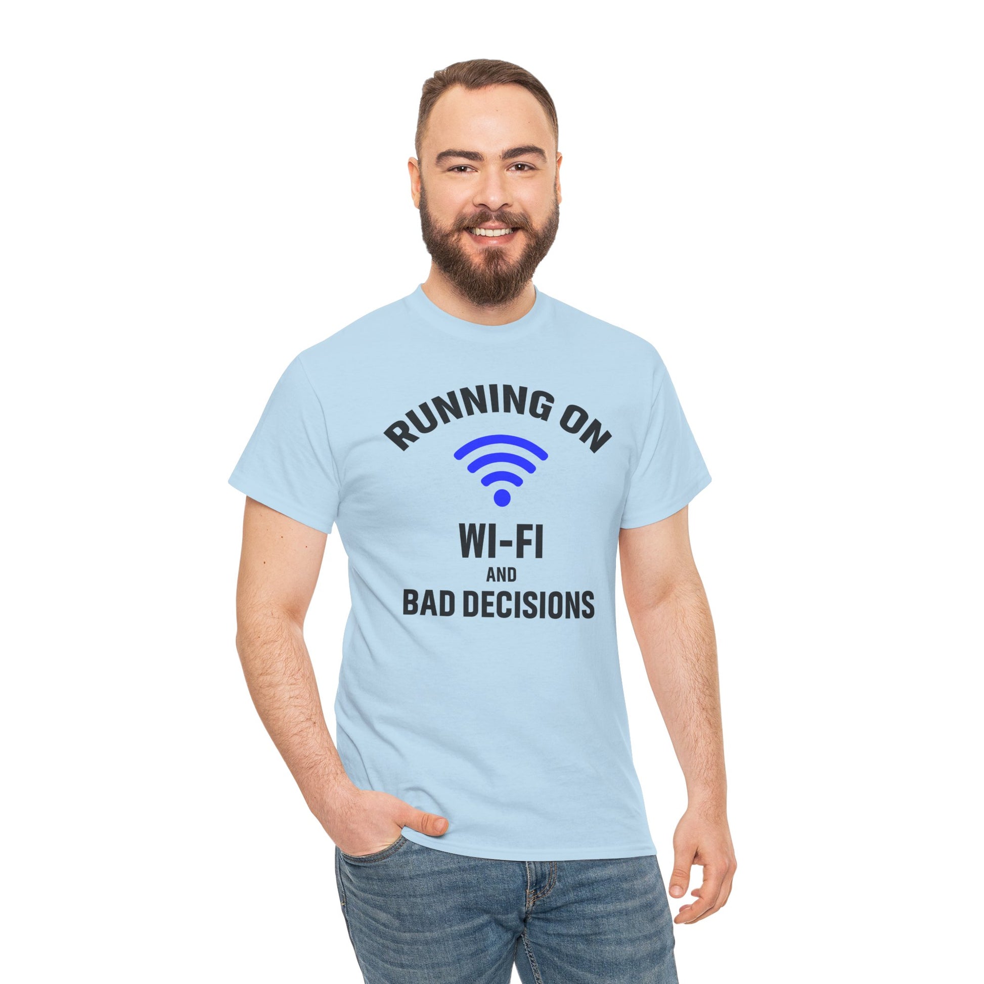 Running On Wi-Fi And Bad Decisions Unisex T-Shirt | Funny Tee for Tech Lovers, Gift for Internet Junkies, Office Gift