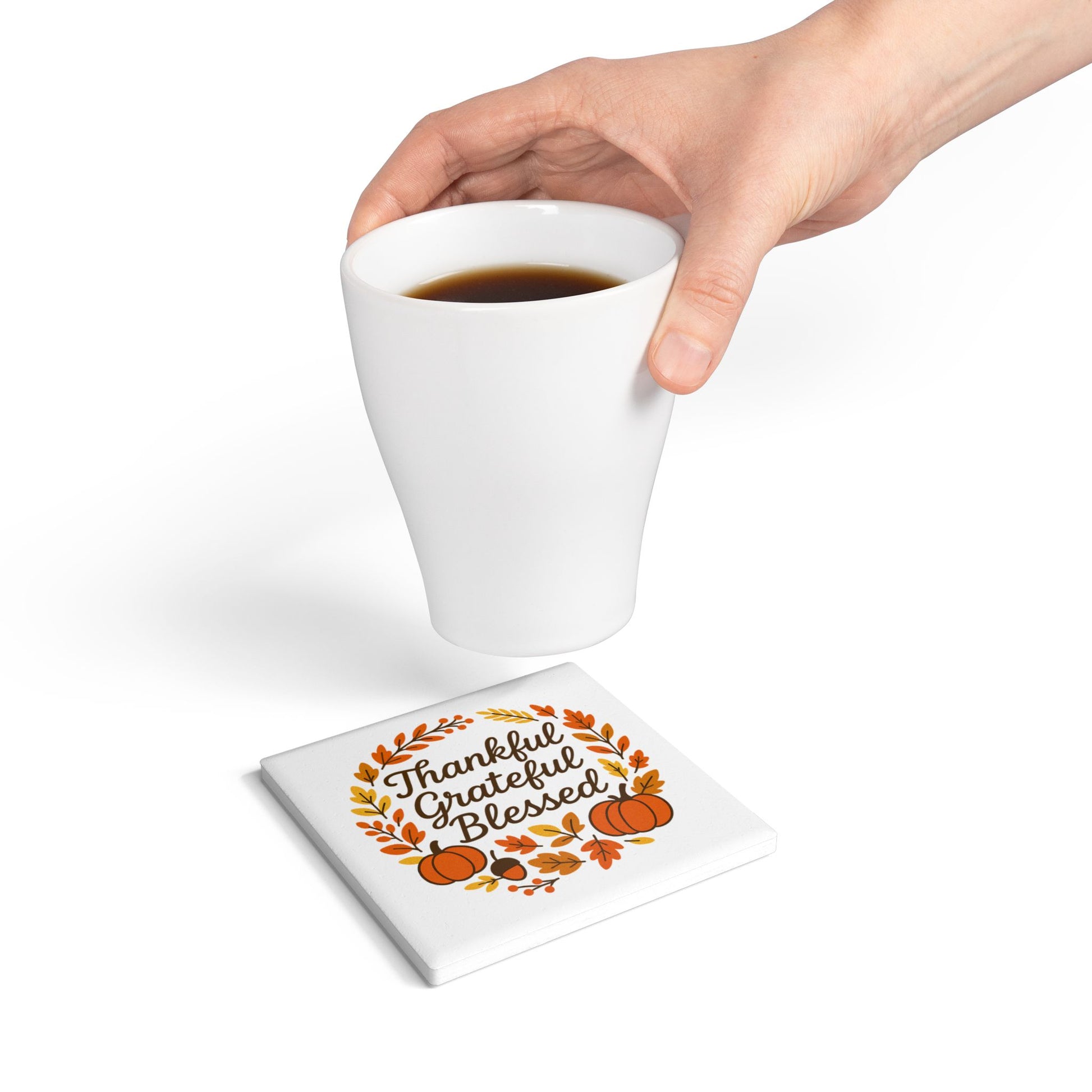 Thankful Grateful Blessed Ceramic Coaster - Fall Decor, Harvest Celebration, Autumn Gift, Thanksgiving Table, Home Decor